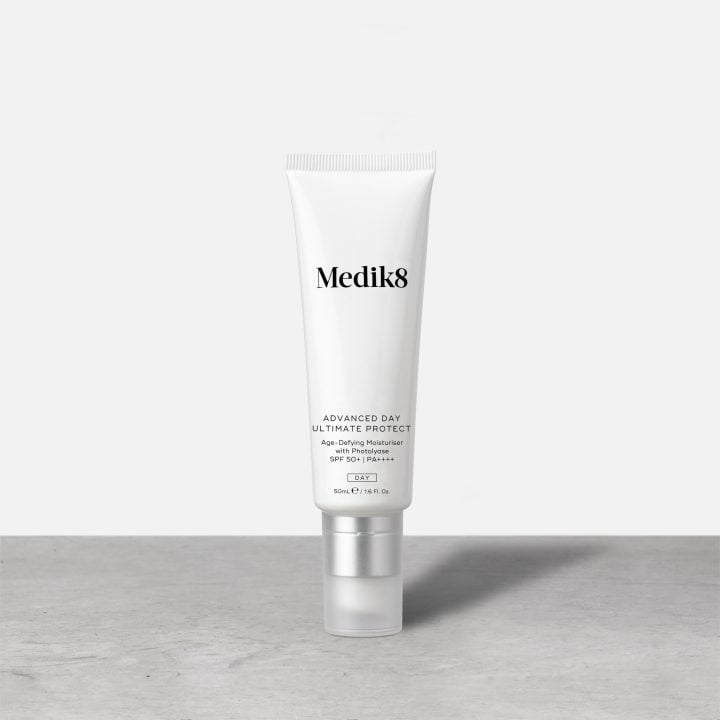 Produkt Medik8 o najwyższym współczynniku ochrony SPF zapewniający najwyższy poziom ochrony przeciwko promieniowaniu UVA: PA++++. Starannie dobrany kompleks stabilnych filtrów przeciwsłonecznych charakteryzuje się doskonałą fotostabilnością i skutecznością. Advanced Day Ultimate Protect został dodatkowo wzbogacony o enzymy naprawcze DNA. Ekspozycja skóry na promieniowanie UV może wywoływać uszkodzenia w strukturze DNA, czego efektem jest osłabienie naturalnej ochrony przed wolnymi rodnikami oraz obniżenie produkcji kolagenu. Aktywowany światłem enzym fotoliazy wspomaga naturalne procesy naprawcze skóry, zapobiegając powstawaniu drobnych linii, zmarszczek i przebarwień powodowanych przez promieniowanie UV. Kapsułkowanie fotoliazy optymalizuje jej przenikanie w głąb skóry, umożliwiając uzyskanie efektów przeciwstarzeniowych nowej generacji w postaci zdrowo wyglądającej, pełnej blasku skóry. Poza promieniowaniem UV nasza skóra wymaga także całorocznej ochrony przed wieloma innymi, negatywnymi czynnikami środowiska, przyspieszającymi starzenie się skóry. Advanced Day Ultimate Protect zawiera pozyskiwany na drodze upcyklingu olejek z nasion borówki amerykańskiej, chroniący skórę przed niebezpiecznym światłem niebieskim, które może powodować uszkodzenia wolnorodnikowe lub widoczne przebarwienia cery. Aktywny olejek z nasion borówki amerykańskiej pochłania niebieskie światło, uniemożliwiając mu dotarcie do skóry. Zawarty w serum ekstrakt z szanty zwyczajnej (Marrubium vulgare) wspomaga naturalną barierę ochronną skóry, skutecznie chroniąc ją przed uszkodzeniami powodowanymi przez zanieczyszczenia środowiska. Karnozyna – dipeptyd o szerokim spektrum właściwości – chroni przed glikacją i promieniowaniem podczerwonym. Glikacja to naturalna reakcja starzeniowa, zachodząca między cząsteczkami cukru a cząsteczkami białka, w wyniku której powstają zaawansowane produkty końcowe glikacji (AGE), skutkujące powstawaniem drobnych linii i zmarszczek. Advanced Day Ultimate Protect wykorzystuje karnozynę w celu hamowania glikacji biorącej udział w procesach starzenia się skóry. Karnozyna chroni także skórę przed rozbijającym kolagen promieniowaniem podczerwonym, które stanowi połowę spektrum promieniowania słonecznego. Odżywczy skwalan i nawilżający kwas hialuronowy zapewniają skórze długotrwałe nawilżenie oraz wygładzają drobne linie i zmarszczki.
