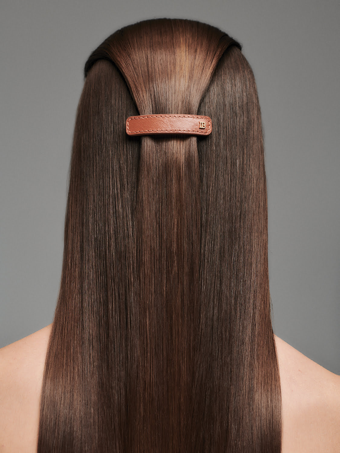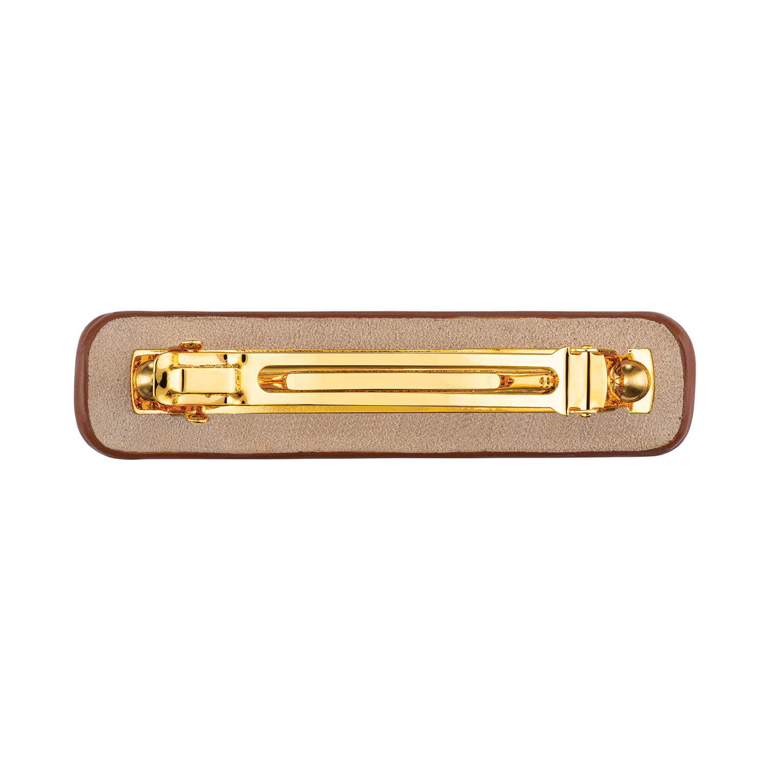 Średniej wielkości spinka z najwyższej jakości naturalnej skóry napa w kolorze koniakowym. Posiada charakterystyczne przeszycia oraz jest pozłacana 18-karatowym złotem monogramem B. Idealnie pasuje do pół upięć. W opakowaniu znajduje się także ściereczka do polerowania spinki, która pomoże utrzymać produkt w idealnym stanie.