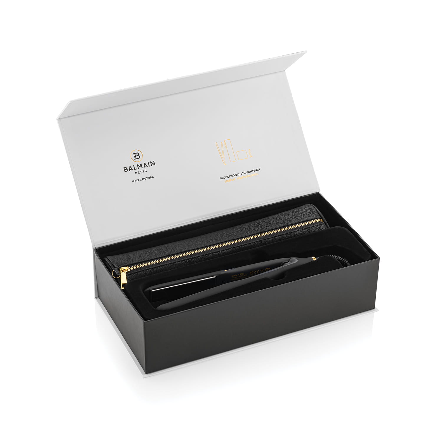 Profesjonalna prostownica o odświeżonym i unowocześnionym designie. Zaprojektowana z błyszczącym czarnym wzorem i matową powierzchnią ze złotymi detalami, które reprezentują charakterystyczne kolory Balmain.