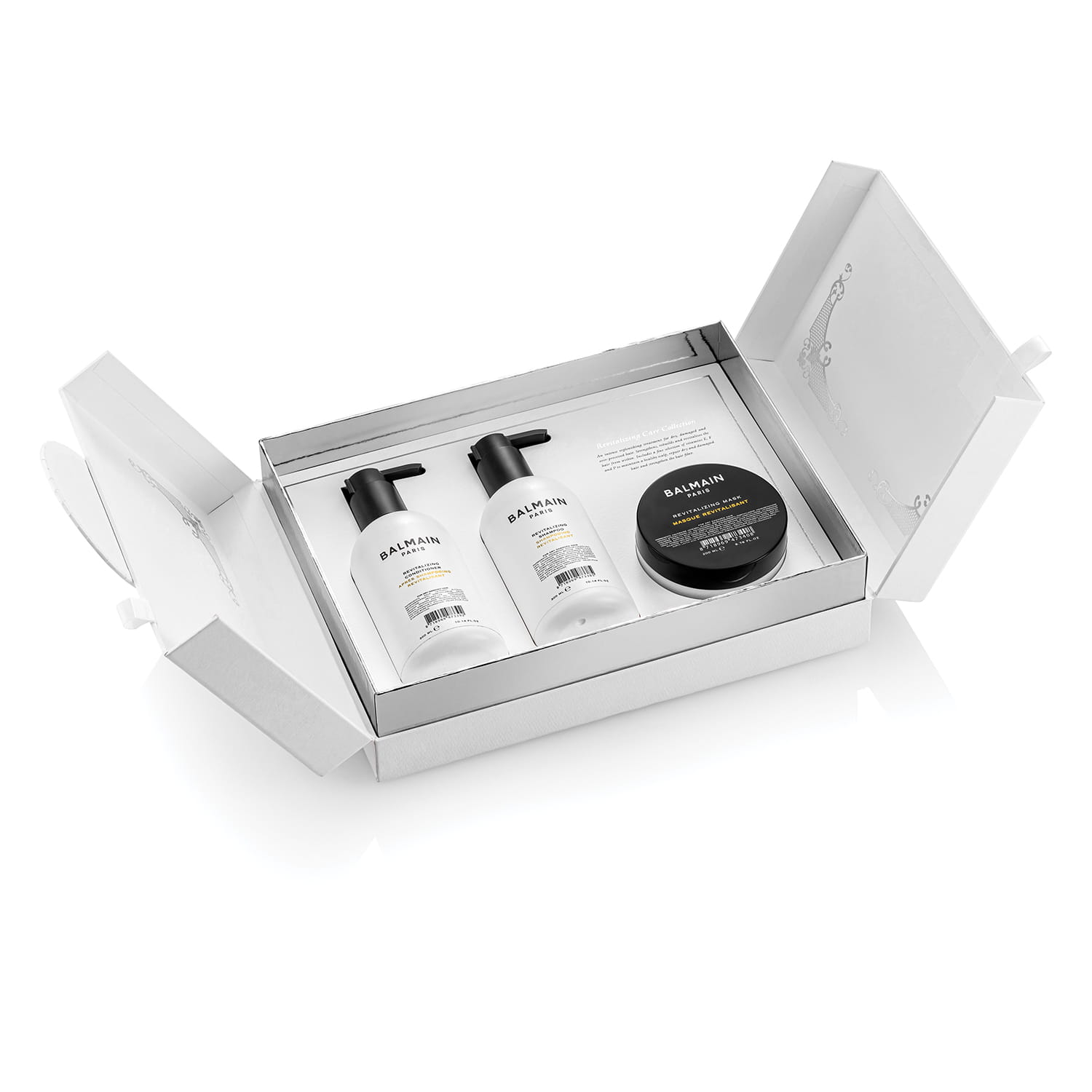 Wspaniale zapakowany zestaw do regeneracji zniszczonych włosów. Nasza rewitalizująca formuła przywraca włosom witalność, zapewniając im jednocześnie optymalne nawilżenie. Dzięki niezapomnianemu zapachowi Balmain, ten zestaw dostarczy Ci doznań przypominających wizytę w luksusowym spa, sprawiając, że poczujesz się jak prawdziwa królowa w swojej łazience.