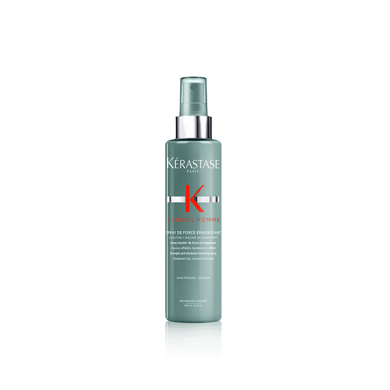 Spray Genesis Homme z marki Kerastase to formuła o właściwościach wzmacniających i pogrubiających, przeznaczona do pielęgnacji osłabionych i cienkich włosów skłonnych do przerzedzania. Pogrubia pasma, zwiększając optycznie masę włosów i wzmacniając je. Zapewnia natychmiastowe wrażenie większej ilości włosów. Oferuje błyskawiczną objętość, która utrzymuje się do 24 godzin* oraz poprawia strukturę włosów od nasady z naturalnym wykończeniem. Lekka, nieklejąca, utrwalająca fryzurę formuła, zapewniająca błyskawiczne pogrubienie każdego pasma i gwarantująca wzmocnienie i efekt bardziej gęstych włosów.