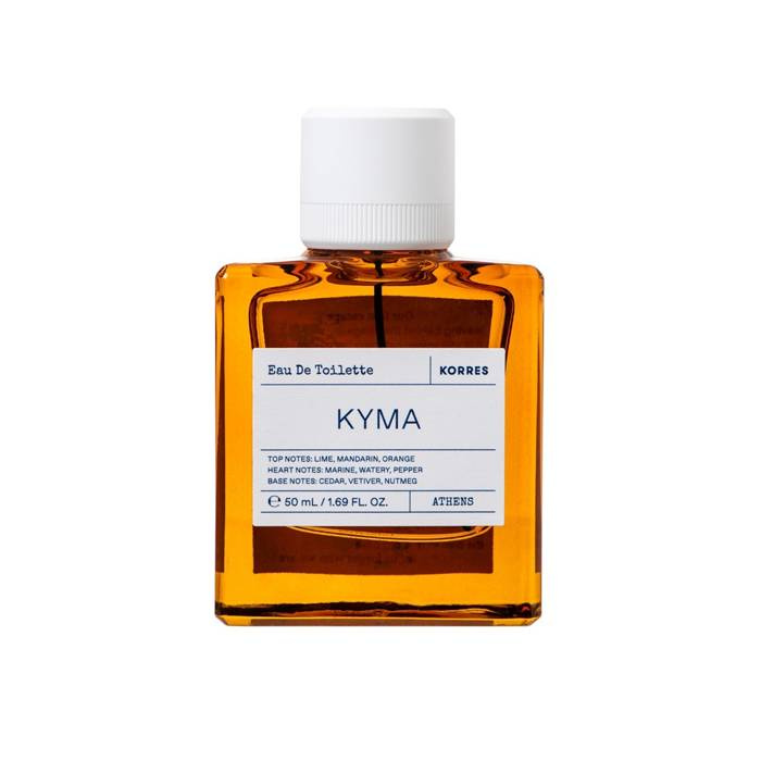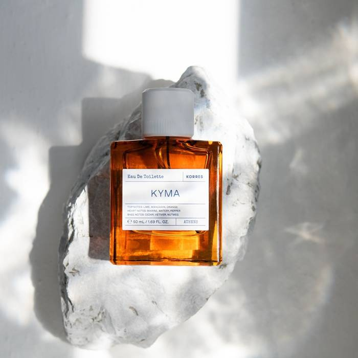 Kyma, woda toaletowa Korres, zawiera aż 87% składników pochodzenia naturalnego. Jej formuła jest wolna od niebiodegradowalnych substancji syntetycznych, takich jak piżmo policykliczne, nitro piżmo, parabeny i ftalany, co zapewnia bezpieczeństwo i komfort użytkowania. Produkt jest odpowiedni również dla wegan.