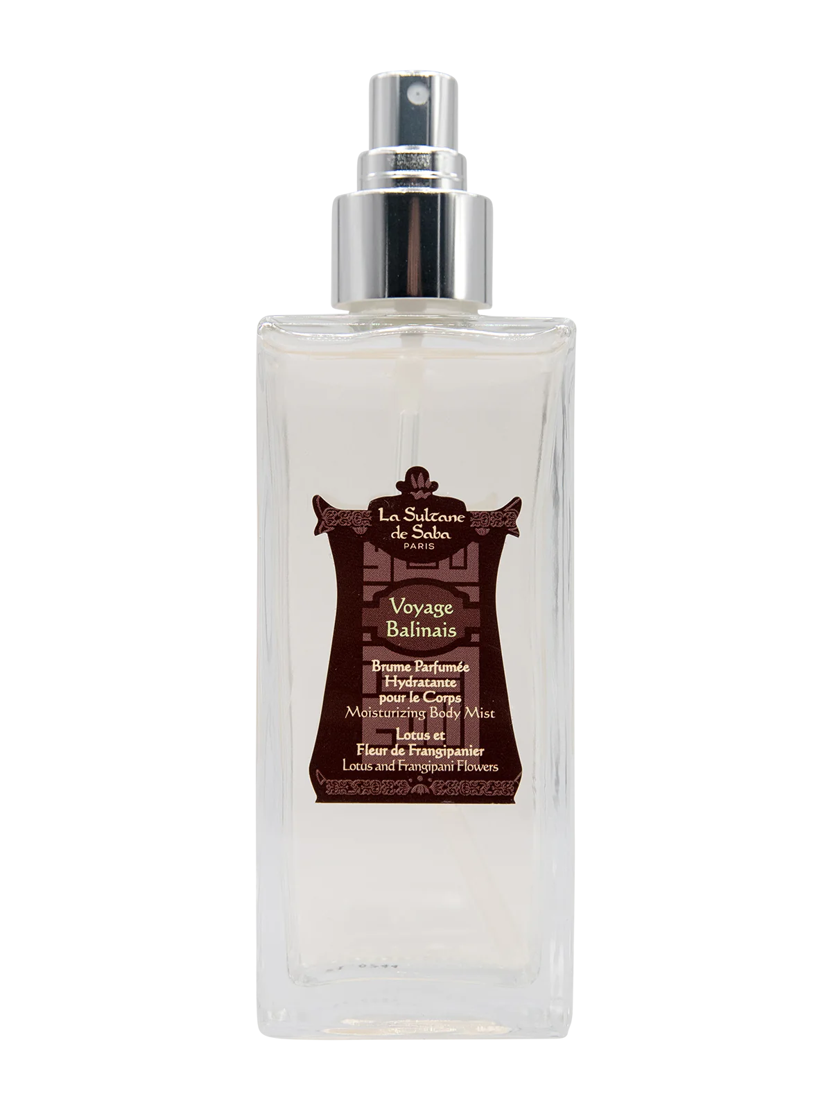 Zmysłowa i nawilżająca mgiełka do ciała. Pozostawia na skórze i włosach subtelny zapach, który utrzymuje się przez cały dzień. Bezpośrednio po aplikacji przynosi natychmiastowe uczucie świeżości i przenosi Cię do cudownego świata La Sultane de Saba. Produkt może być również stosowany jako mgiełka do pościeli, przynosząc spokój i dobre samopoczucie. Zawarty w składzie aromat kwiatów lotosu i frangipani, które kwitną na wyspie Bali, przywołuje wspomnienia beztroskich słonecznych dni oraz sekretnych rytuałów piękna.
