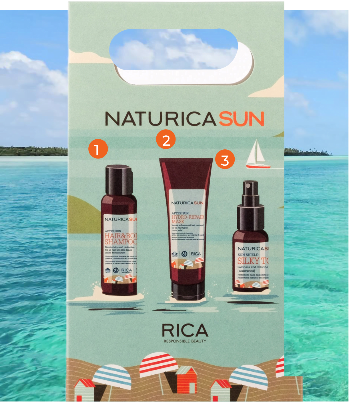 Zestaw Naturica Sun zawiera szampon 100 ml, maskę 75 ml i serum 50 ml, które charakteryzują się obecnością łagodnych środków powierzchniowo czynnych, niezwykle delikatnych i łatwo biodegradowalnych. Produkty są również naturalne i przyjazne dla rafy filtrów UV.