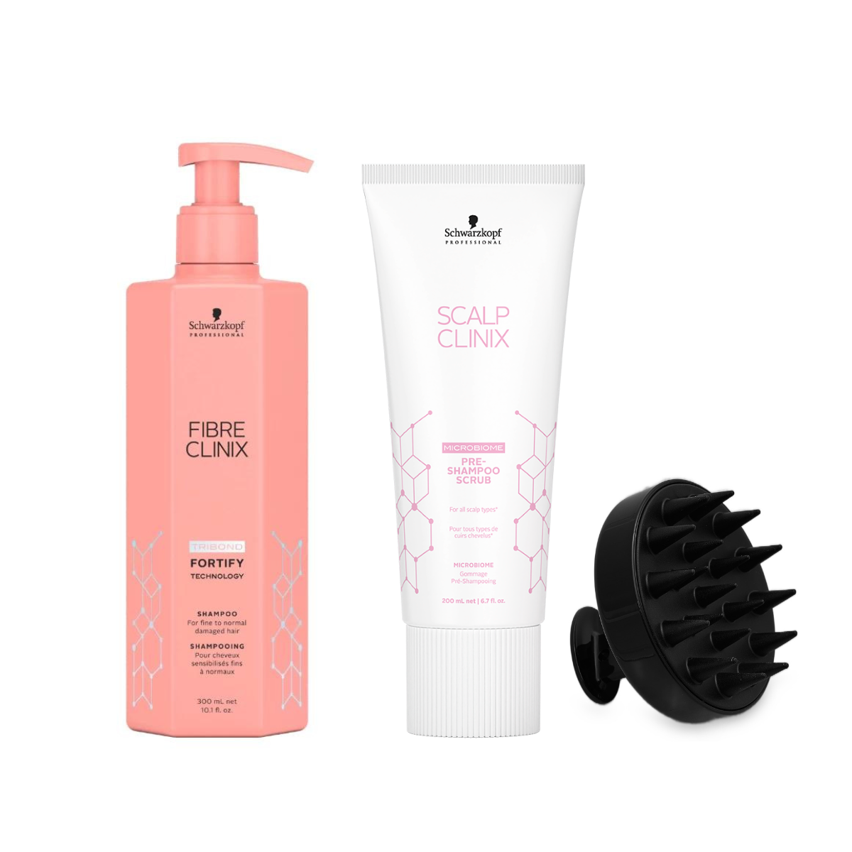 Zapewnij swoim włosom kompleksową pielęgnację dzięki naszemu zestawowi wzmacniająco-oczyszczającemu, który składa się z szamponu, peelingu do skóry głowy oraz masażera. Nasze produkty oparte są na zaawansowanej formule z niacynamidem, zaprojektowanej specjalnie dla zniszczonych włosów, aby przywrócić im zdrowy wygląd i elastyczność.