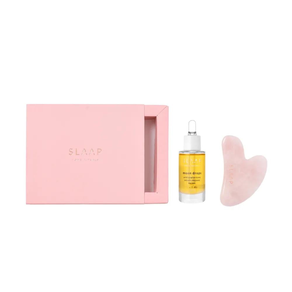 W skład zestawu wchodzi bestsellerowe serum Moon Drops, stanowiące odżywczy eliksir pełen cennych olejów, witamin i antyoksydantów o silnej mocy regeneracyjnej i przeciwstarzeniowej. Wzbogacone o naturalne olejki eteryczne z bergamotki, drzewa sandałowego i trawy cytrynowej, serum pomaga wejść w stan głębokiego relaksu oraz wyciszyć umysł. Uzupełnieniem zestawu jest kamień Gua Sha wykonany z różowego kwarcu. Ma formę półksiężyca o gładkich brzegach, dzięki czemu idealnie dopasowuje się do kształtu twarzy. Poprzez delikatny ucisk pomaga uwolnić napięcie z okolic, w których kumuluje się całodzienny stres i negatywna energia, takich jak skronie, mięśnie żuchwy czy obszar między brwiami. Ponadto usprawnia przepływ limfy i pobudza krążenie krwi, co wpływa na lepsze dotlenienie oraz poprawę jędrności skóry.